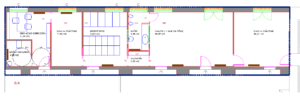 En el capítulo de revestimientos y acabados, se proyecta la aplicación de una capa base de mortero de cal y cemento de 15 mm de espesor en paramentos interiores, seguida de pintura plástica mate sobre paramentos de mortero y yeso. Se instalan pavimentos vinílicos homogéneos de 2 mm de espesor en aulas y zonas comunes, así como un modelo antideslizante en baños infantiles. En el despacho de dirección, se opta por un pavimento laminado de clase 33 con resistencia AC4, colocado sobre lámina de espuma de polietileno. Se colocan también rodapiés de MDF de 58×12 mm con acabado imitación madera. En los baños, se revisten las paredes con gres porcelánico esmaltado de 200x200x10 mm, con colocación en capa fina mediante adhesivo cementoso C2 TE.