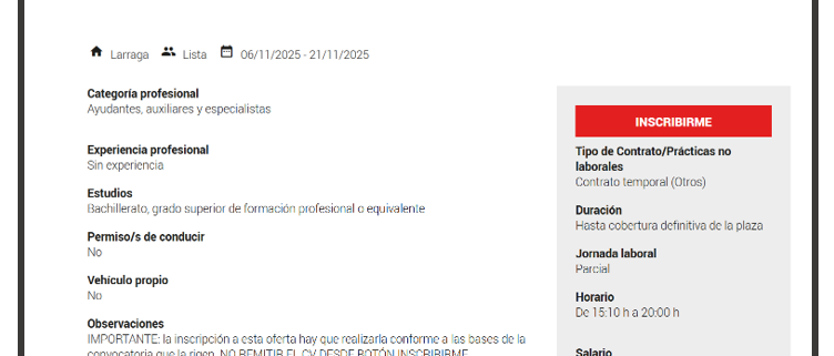 IMPORTANTE: la inscripción a esta oferta hay que realizarla conforme a las bases de la convocatoria que la rigen. NO REMITIR EL CV DESDE BOTÓN INSCRIBIRME.